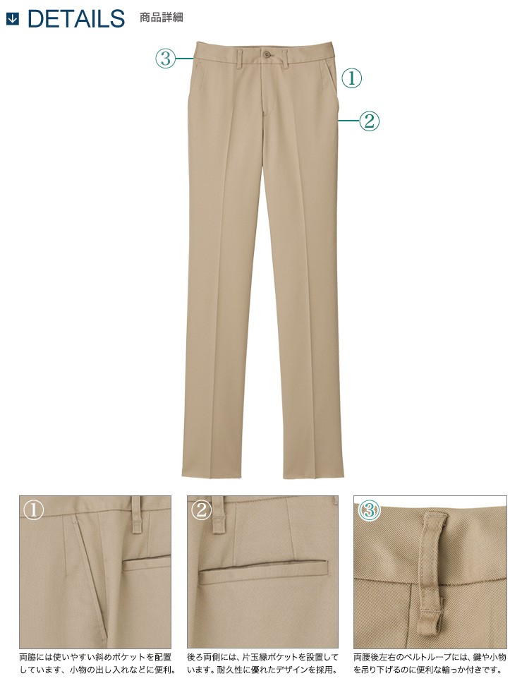 - 両腰斜めポケット、後ろ両側片玉縁ポケット、ベルトループ後ろ左右輪っか付き