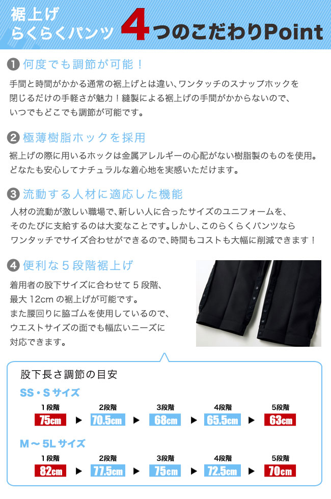 裾上げがボタン止めで調節できるのはとても便利です。どうしてもサイズと裾のバランスが合わない現場では大変、重宝しております。