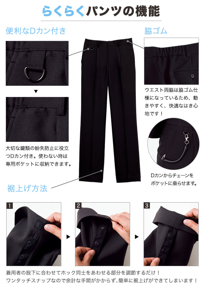 - パンツ裾上げ可能、脇ゴム入り、Dカン付き
