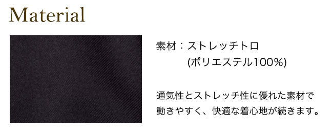 造りはしっかりしており、洗濯後のアイロン掛けも最低限で済むと思われる点は好評価。ただ裾上げ、、確かにボタン方式で楽は楽なのですが、上げた分の生地が余った感じになる上、2点固定の為に少々だらしない感じの印象のフォルムになります。サービススタッフの場合、客前にも出る事を考えるとやはりこれは宜しく無い。