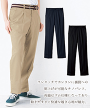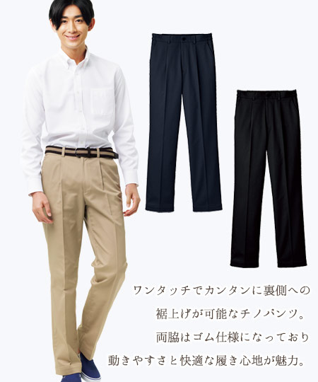 ワンタッチで楽に裾上げが出来る男女兼用のチノパンツ。