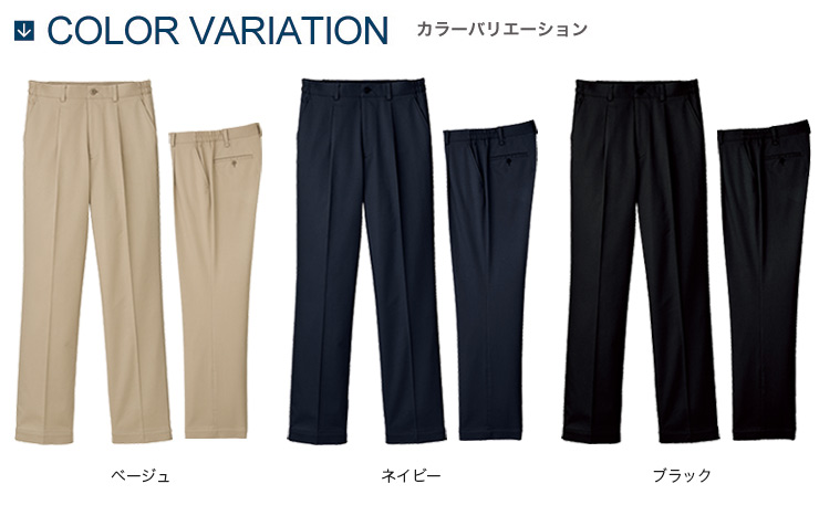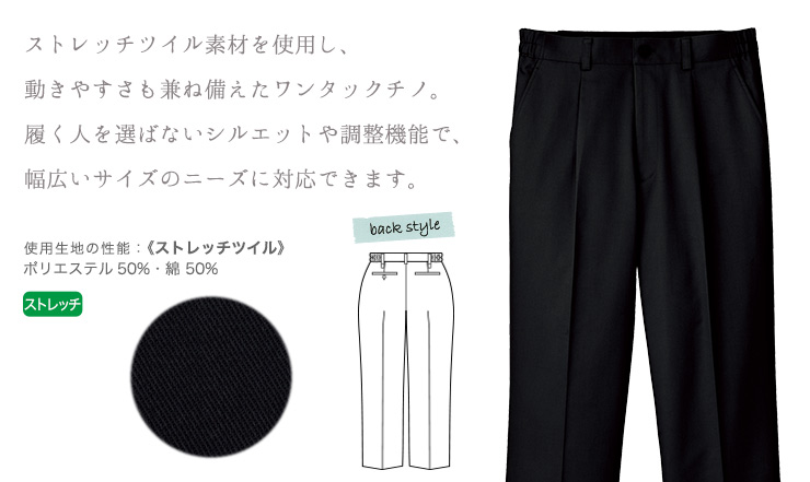 - パンツ裾上げ機能、ストレッチ、両腰斜めポケット、後ろ両側片玉縁ポケット、ベルトループ後ろ左右輪っか付き、ウエスト両脇脇ゴム入り、フロントワンタック
