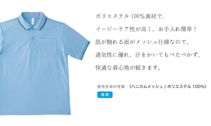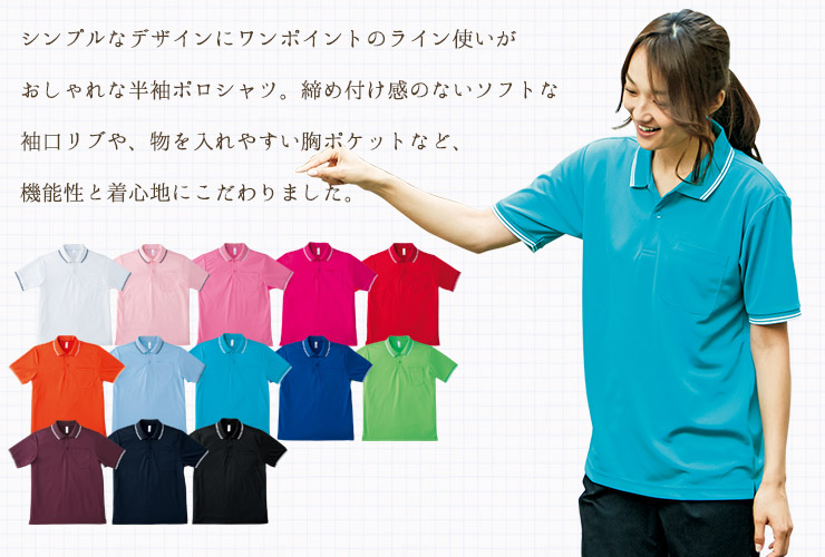 シンプルなデザインにワンポイントのライン使いがおしゃれな半袖ポロシャツ。 締め付け感のないソフトな袖口リブや、物を入れやすい胸ポケットなど、機能性と着心地にこだわりました。