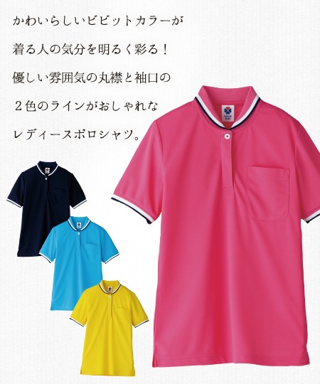 丸くて優しい雰囲気のショールカラーに2色のラインが入ることでよりすっきりした印象を与えます。 シリコンボタンや両脇裾スリットなど、着る人にやさしい機能も兼ね備えたレディースポロシャツ。