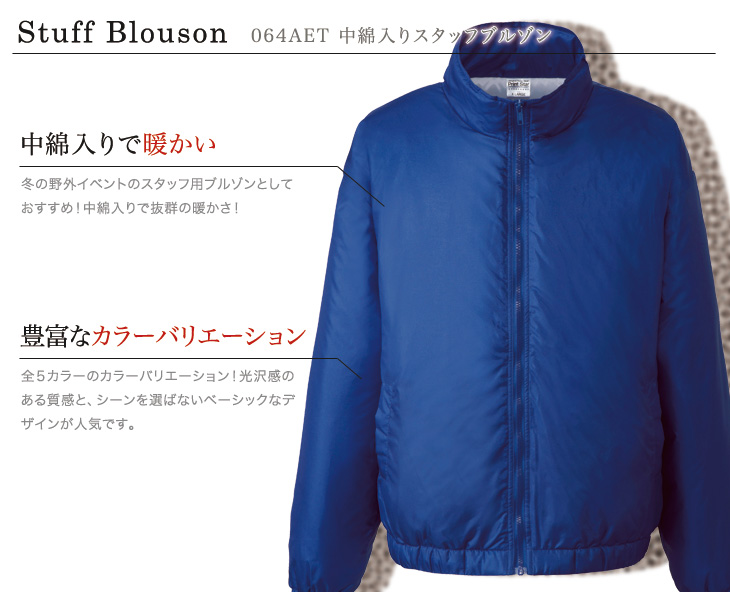 中綿入りで冬でも暖かく着用頂けるスタッフブルゾン。光沢感のある質感と、シーンを選ばないベーシックなデザインが人気のアイテムです。