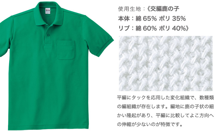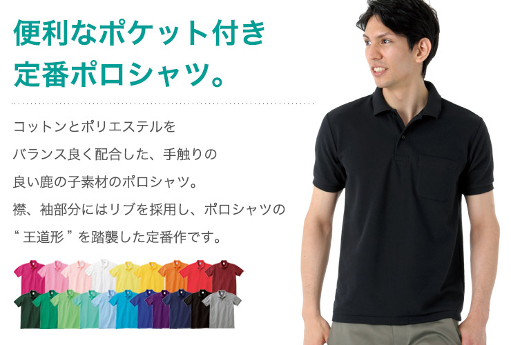 ポロシャツの王道!コットンとポリエステルをバランス良く配合した、手触りの良い鹿の子素材のポロシャツ。襟、袖部分にはリブを採用し、ポロシャツの“王道形”を踏襲した定番作です。