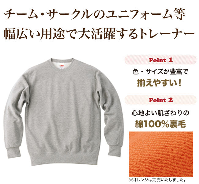 トムスのスタンダードな長袖トレーナー。色やサイズが豊富で揃えやすく、心地よい肌触りの綿100%裏毛!介護などの制服は勿論、チームやサークルのお揃いのユニフォームなど、幅広い用途で大活躍するトレーナーです!