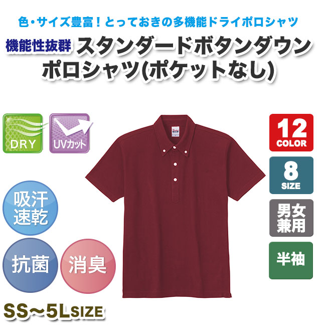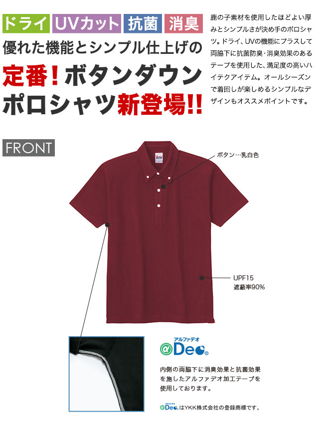 シンプル仕上げの定番ボタンダウンポロシャツ新登場!!ドライ・UVカット・抗菌・消臭。優れた機能性を兼ね備えています。
