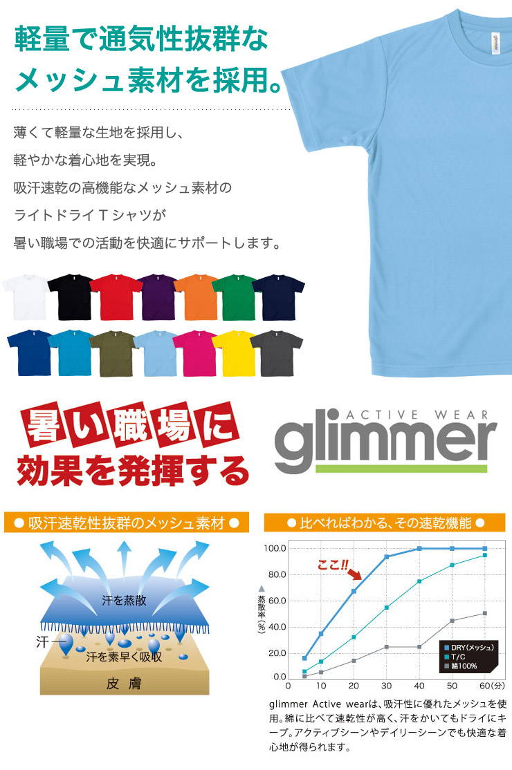 吸汗速乾の高機能なメッシュ素材を採用した ライトドライTシャツが 暑い職場での活動を快適にサポートします。