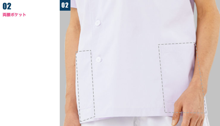 - 両腰ポケット、左胸ポケット、右側ボタン留め