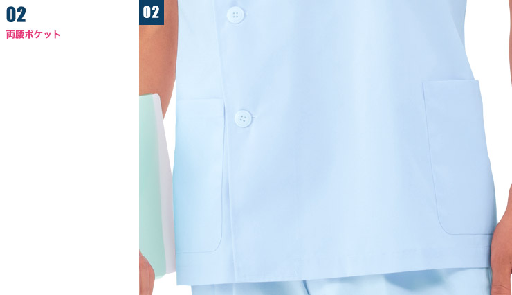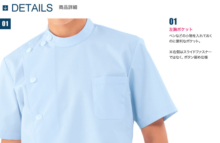 - 左胸ポケット、両腰ポケット、右側ボタン留め