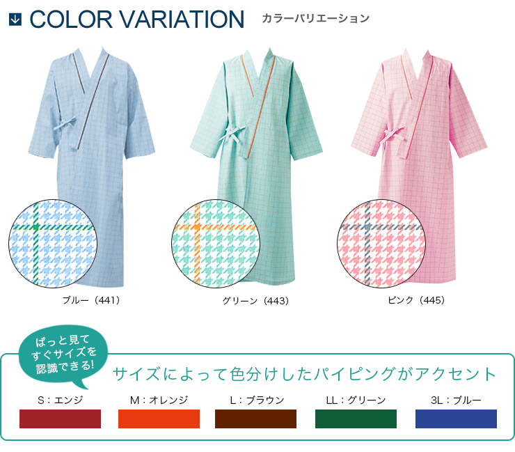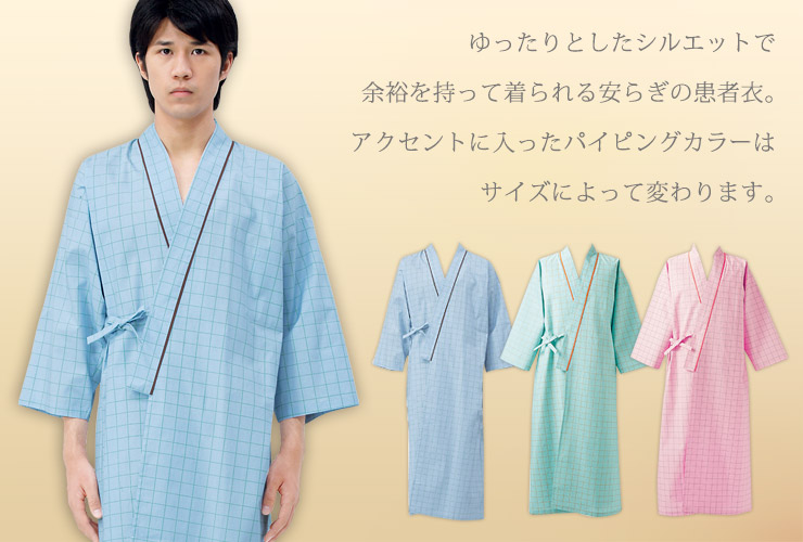 ゆったりとしたシルエットで余裕を持って着られる安らぎの患者衣は、