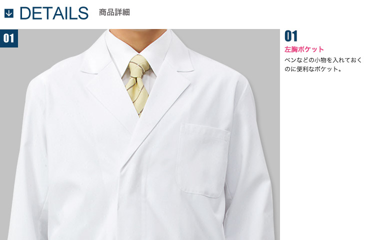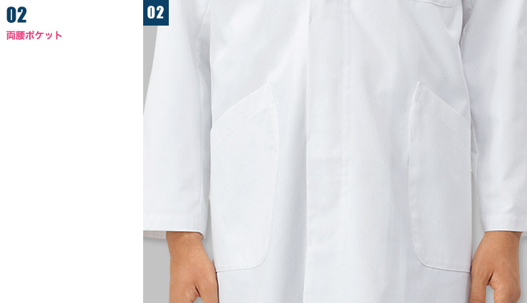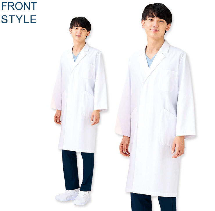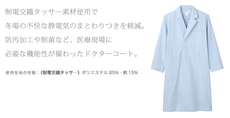 すっきりした印象を与えるボタンが見えないシングルタイプのドクターコート。 帯電防止、防汚加工、制菌加工、透け防止など医療現場に必要な機能性を兼ね備えています。 S~3Lまでの豊富なサイズ展開。