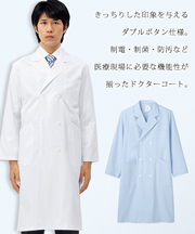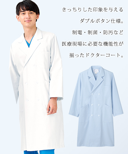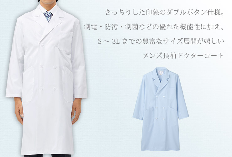 きちんと感のあるダブルボタン仕様のメンズ長袖ドクターコート。