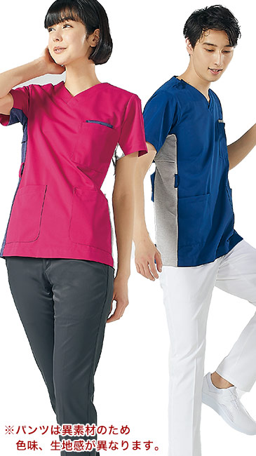 両サイドの配色部分に使用した“デュアルファイン”は、やわらかなニット素材で動きやすく、汗をかいても表面に染み出しにくい機能素材。 さらに立体裁断でスムーズな動きを実現する、快適スクラブです。