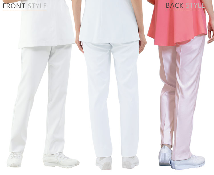 - ノータック、ファスナー、両脇ゴム、両腰ポケット、透け防止裏地付き