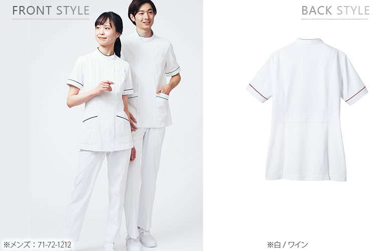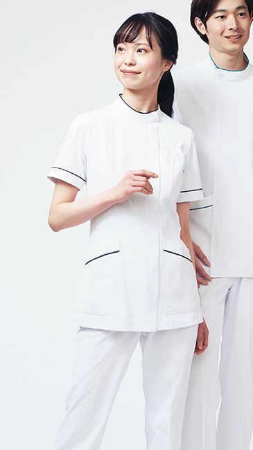 清涼感のあるさわやかな白に、カラーのパイピングがアクセント。男女ペアで揃うシンプルなデザインの上質なケーシーです。