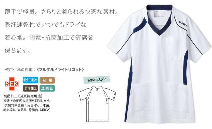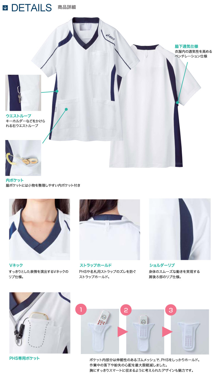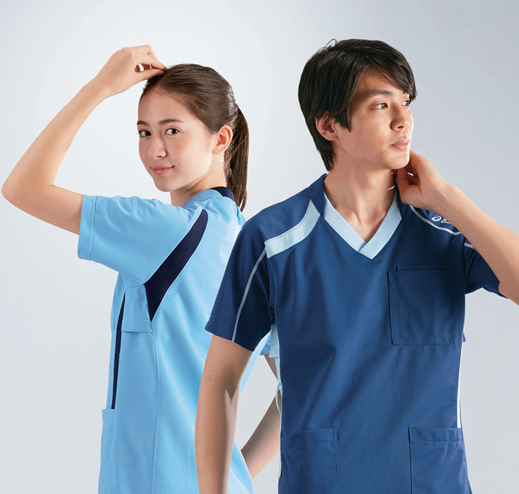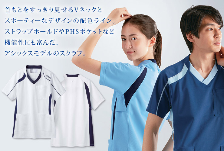 トレンド感のあるスポーティーなデザインと、PHSポケットやショルダーリブなど 機能性を両立させた、アシックスのメディカルウエア。