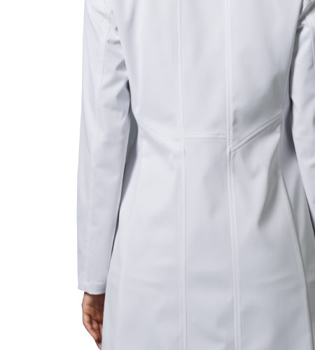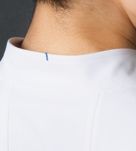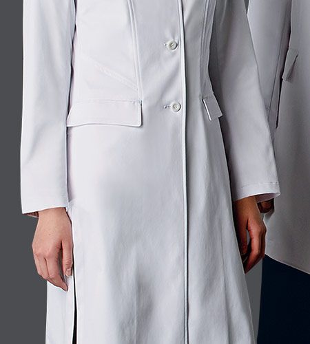 コシノジュンコがデザインする医療ユニフォーム。機能美を追求した新しいプレミアムシリーズ。背面切り替えの位置とウエストの絞りが高い位置なので、体のラインが美しく見えます。