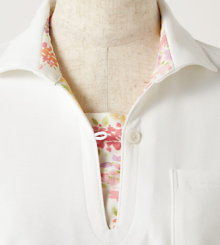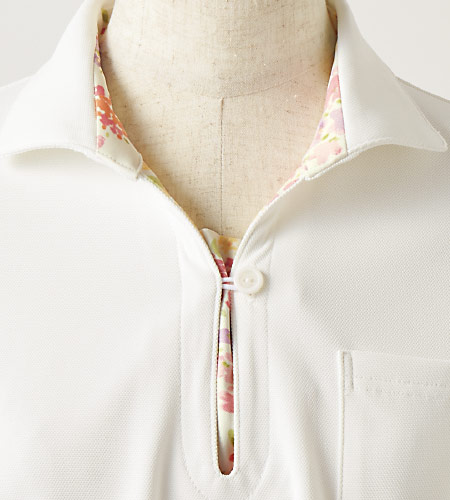 LAURA ASHLEY(ローラ アシュレイ)の華やかで可憐なシルエットが特徴のポロシャツ。胸元のボタンは2WAY仕様になっており、ボタンの開け閉めで2つのデザインが楽しめます。袖口にさりげない花柄プリント生地とロゴが相まって可愛らしい印象を与えてくれます。