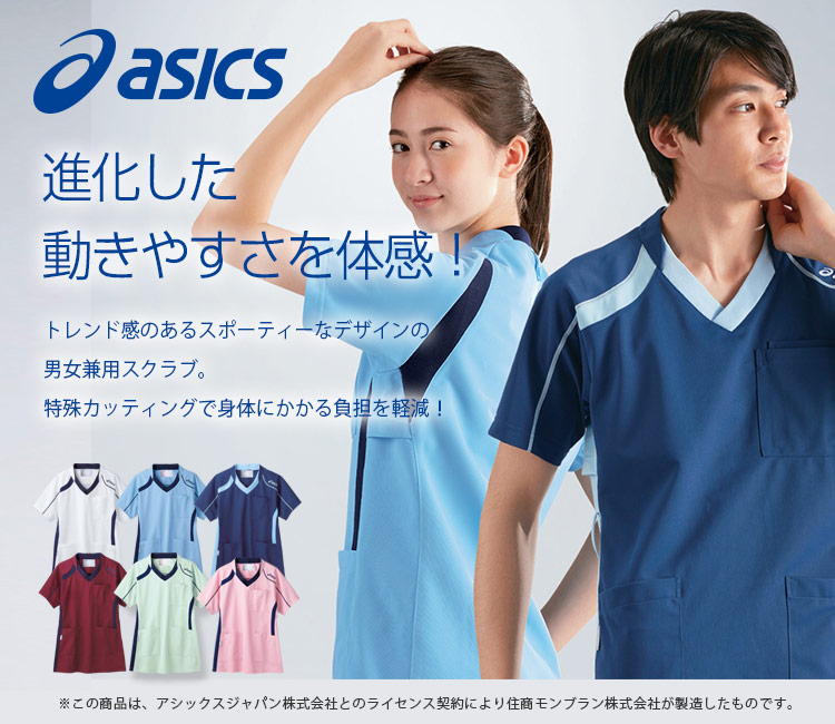 トレンド感のあるスポーティーなデザインと、PHSポケットやショルダーリブなど 機能性を両立させた、アシックスのメディカルウエア。