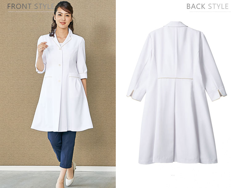 女性医師のための美しいドクターコート。着映えするファッション性高いワンピースのようなエレガントなシルエット、上品で華やかなゴールドのパイピングなどこだわりがつまったレディースドクターコート。