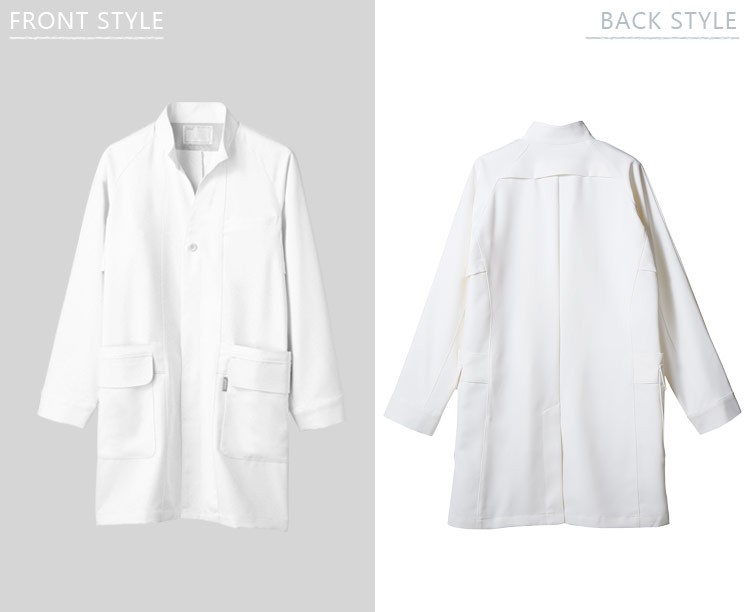 - SEK制菌加工、帯電防止、防汚加工、透け防止、内襟メッシュ、襟元通気仕様、脇下立体裁断・通気仕様、ダブルポケット