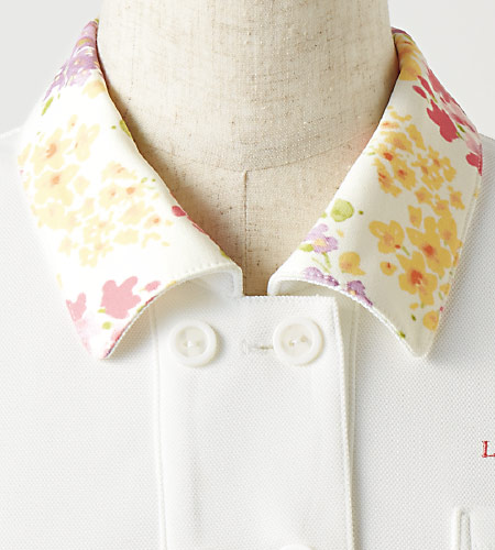 LAURA ASHLEY(ローラ アシュレイ)の華やかで可憐なシルエットが特徴のポロシャツ。襟は全て花柄プリント生地を使用しており、ダブルボタンを採用したことにより、より花柄が生かされるデザインになっております。