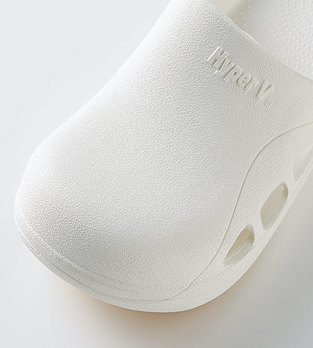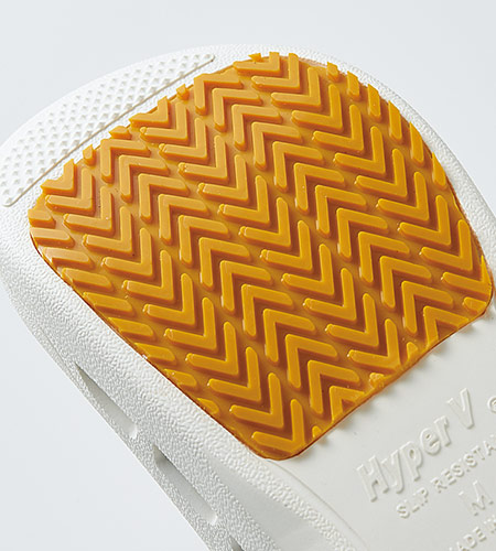 水・油・石鹸水でもすべりにくい「ハイパーV®」を使用したゴム底を装備。安全なつま先部分