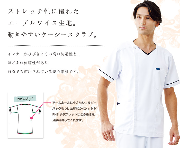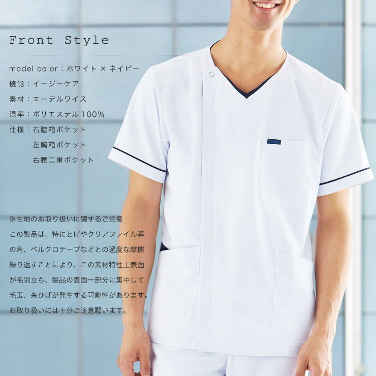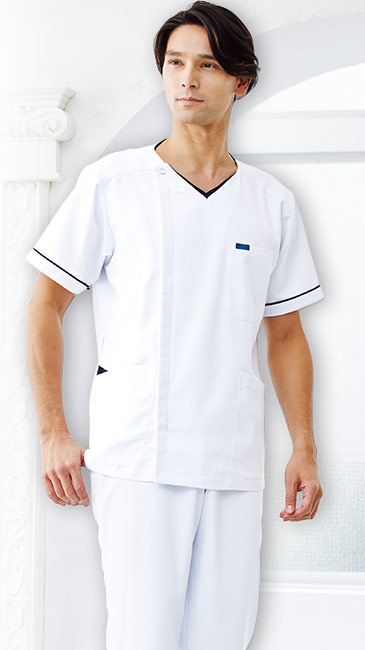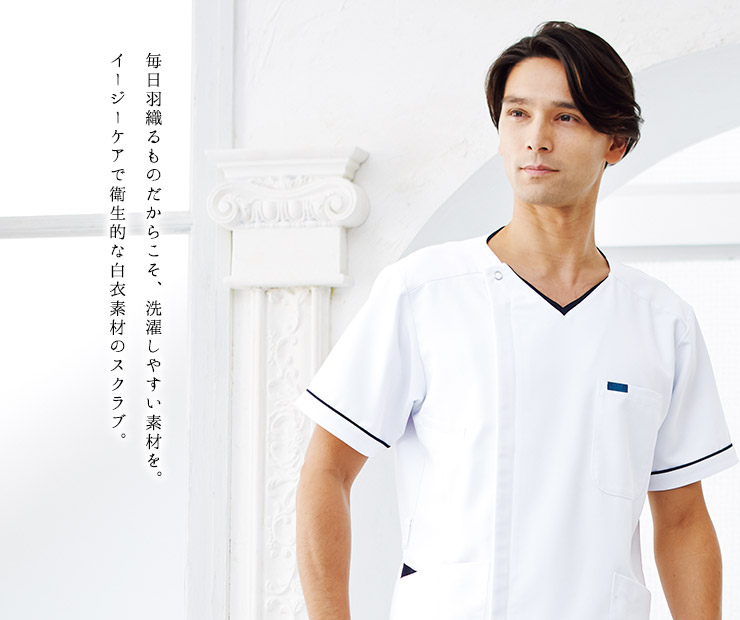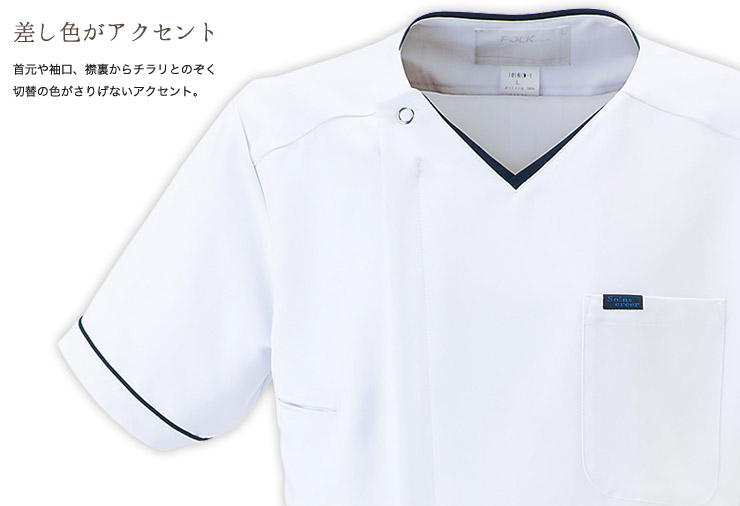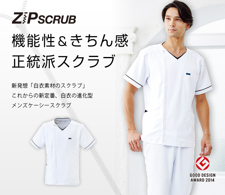 新発想「白衣素材のスクラブ」。目指したのは、正統派とケーシーのような機能性の融合です。 医療現場に嬉しい着脱しやすいメンズジップスクラブジャケット。 "ジップスクラブ"ならび"ジップアップスクラブ"はフォーク(FOLK)の登録商標です。