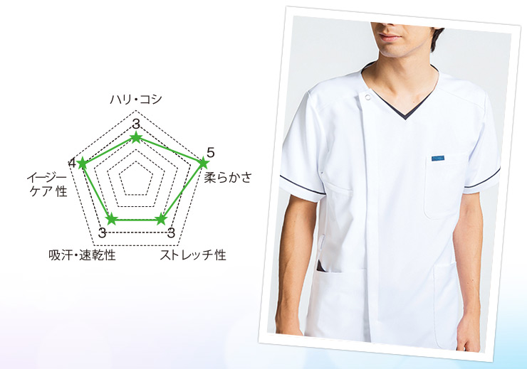 - ストレッチ、透け防止、防汚防塵、制電、吸汗、SEK制菌