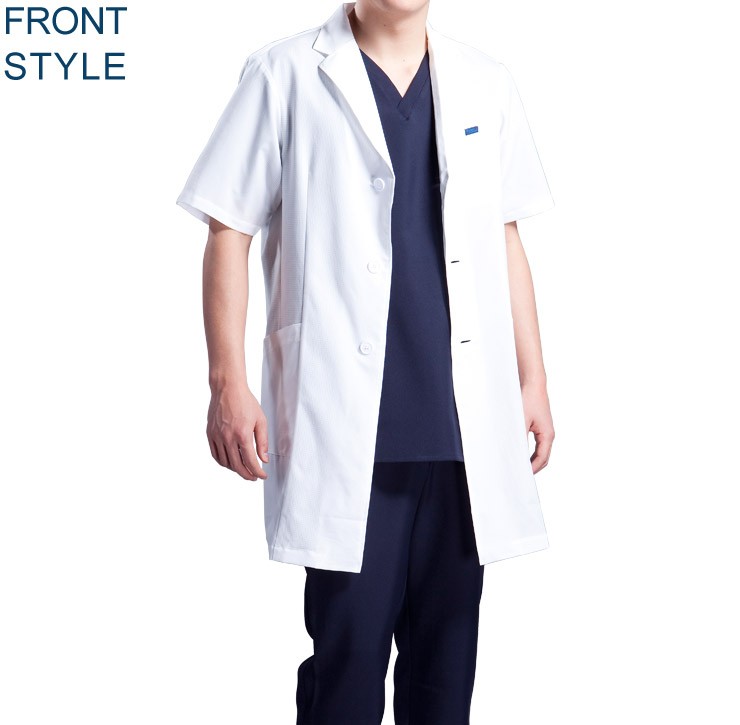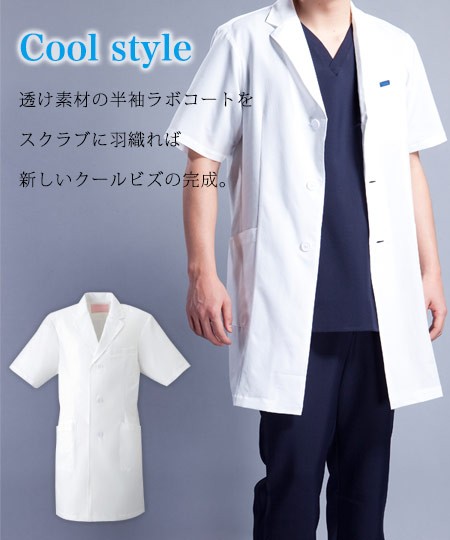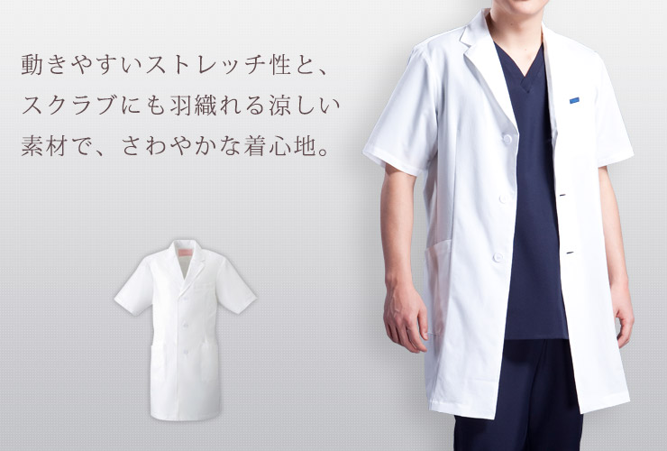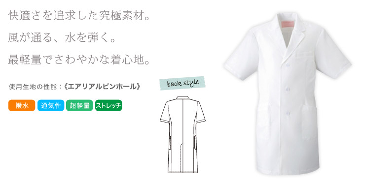 快適さを追求した究極素材「エアリアルピンホール」を使用した半袖の男子シングルコートです。 超軽量で涼しい着心地が好評のラボコート。 透け素材の半袖ラボコートをスクラブに羽織れば新しいクールビズが完成します。