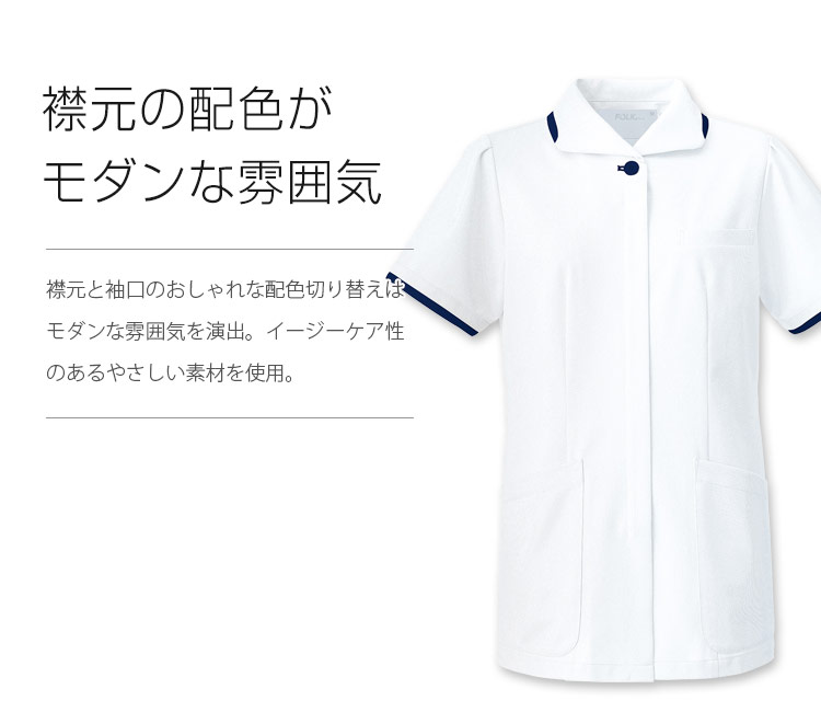 襟元と袖口の配色切り替えは、これまでにないモダンなデザイン。 ストレッチ性とコットンのやさしさを兼ね備えたイージーケア性の高い素材を使用。