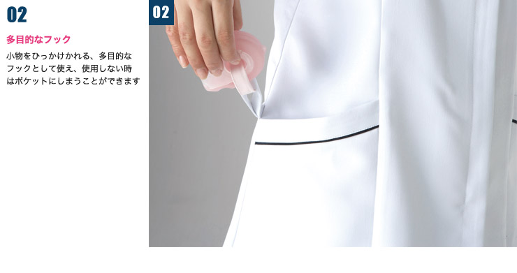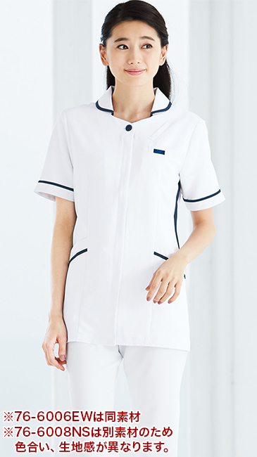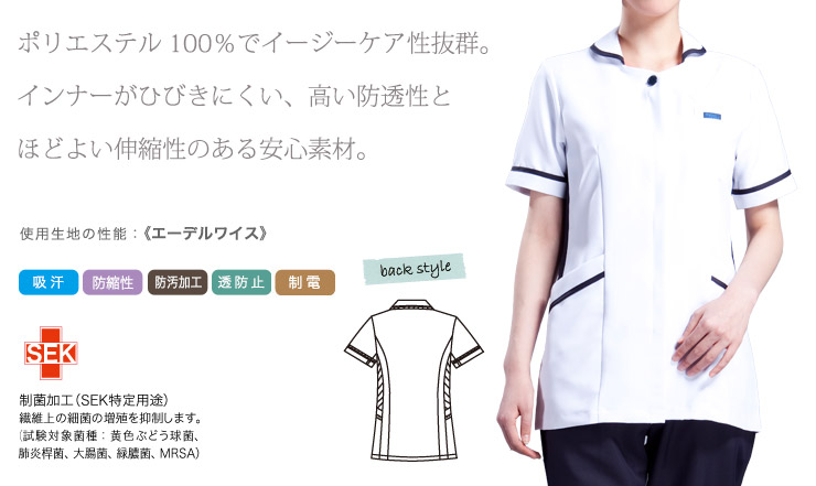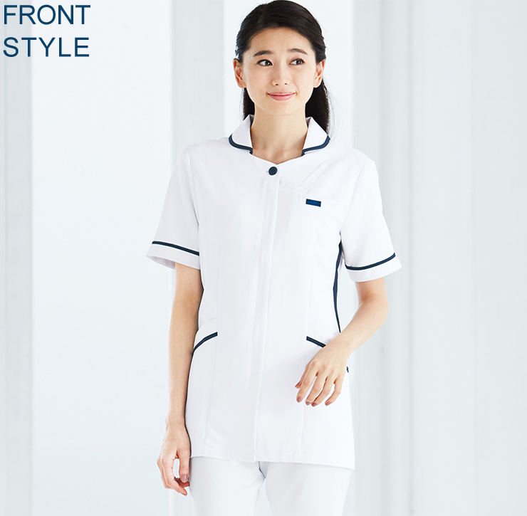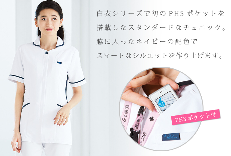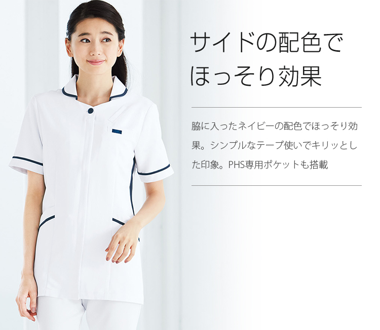 白衣で初のPHSポケットを採用。脇に入ったネイビーの配色が、すっきりしたシルエットを実現。 汚れの目立ちにくいイージーケア性の高い素材を使用した、シンプルでおしゃれなチュニック。