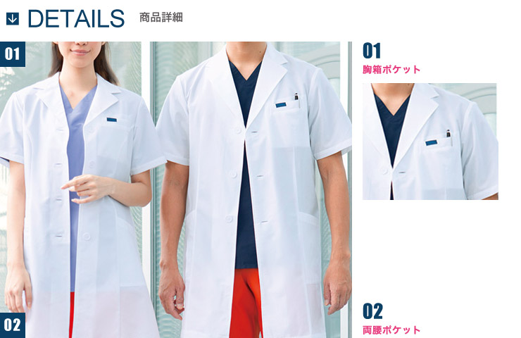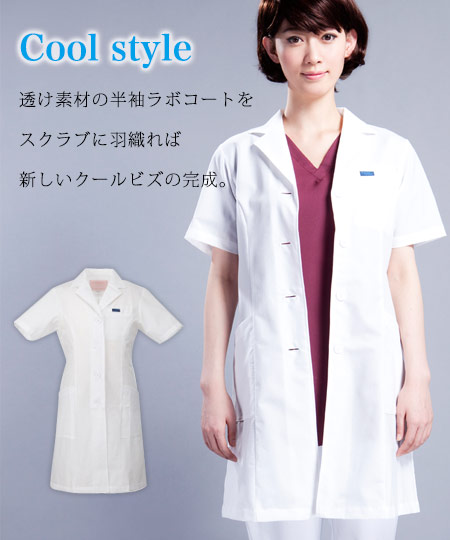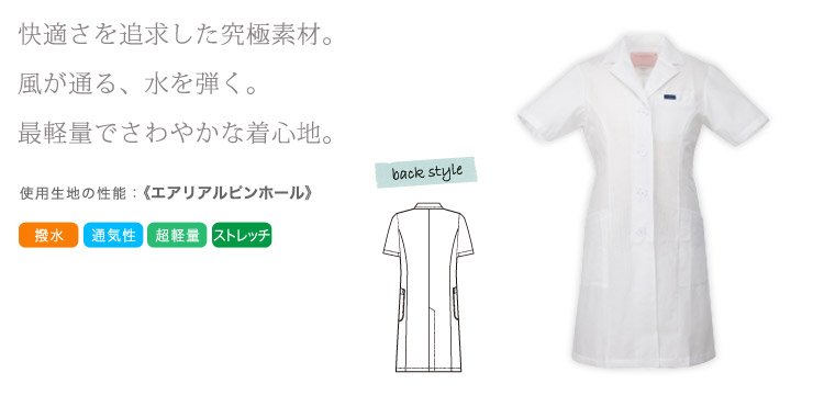快適さを追求した究極素材「エアリアルピンホール」を使用した半袖の女子シングルコートです。 超軽量で涼しい着心地が好評のラボコート。 透け素材でつくる細身シルエットがスタイリッシュなスタイルを演出します。