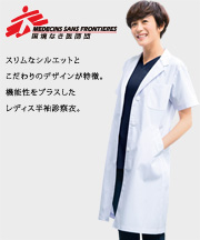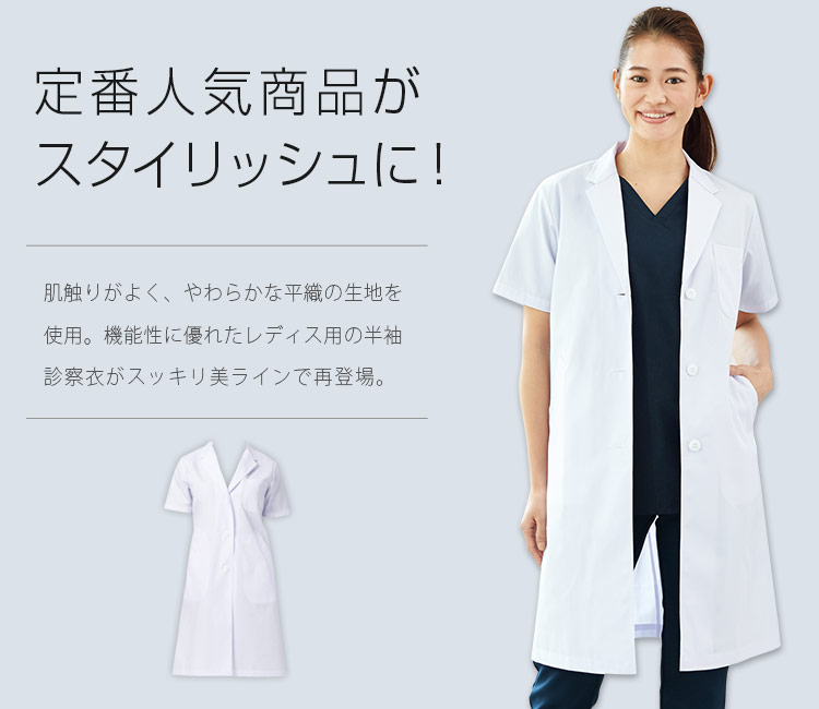 30年来のロングセラー商品をすっきりとしたシルエットに変え、スタイリッシュにリニューアル! 肌触りがよく、やわらかな平織の生地を使用した機能性に優れたレディス半袖診察衣。