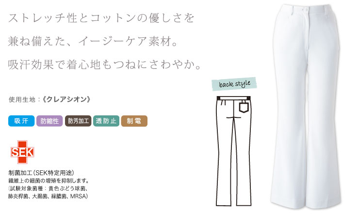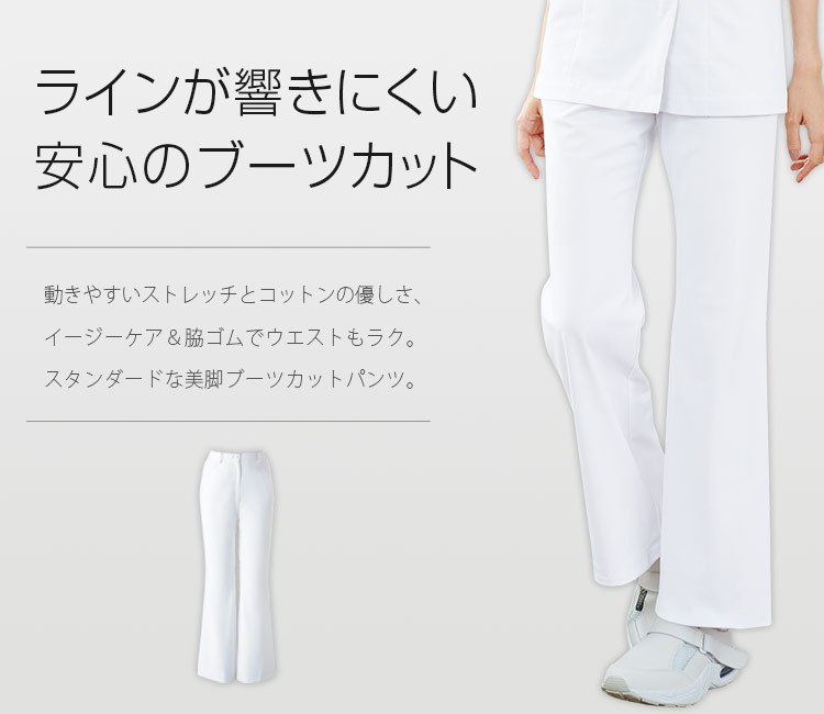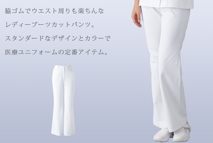 スタンダードなデザインのレデイースブーツカットパンツ。 ストレッチ性とコットンの優しさを兼ね備えた素材を使用し、バックにはメッシュ裏地を採用することで、安心したヒップラインを実現。