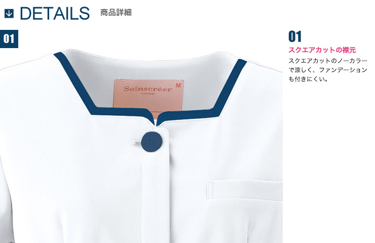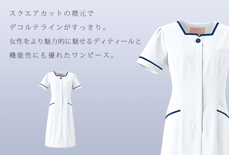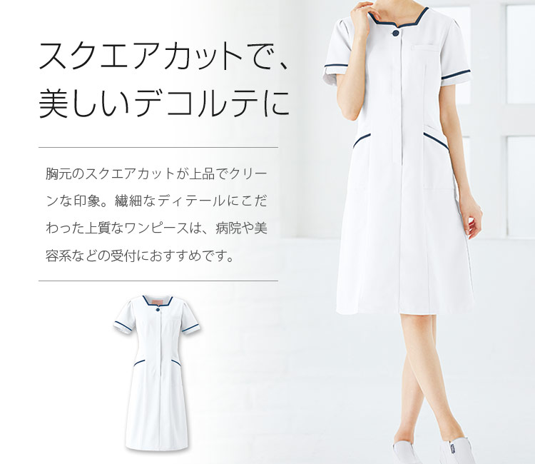 落ち着いたシックなカラーバリエーションのワンピース。クリーンな印象の胸元のスクエアカットなど、繊細なディティールにこだわった上質なメディカルウェア。インナーがひびきにくい高い防透性の素材を使用し、ほどよい伸縮性のある安心素材です。