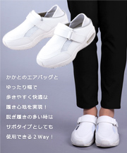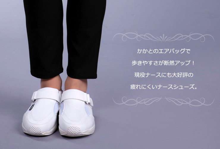 毎日忙しく歩きまわるナースのために生まれたシューズです。エアバッグで歩きやすさが断然アップ!