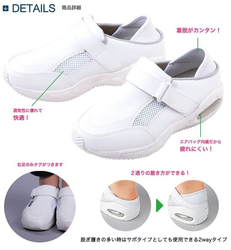 脱ぎ履きの多い時はサボタイプとしても使える、2wayタイプのナースシューズです。
