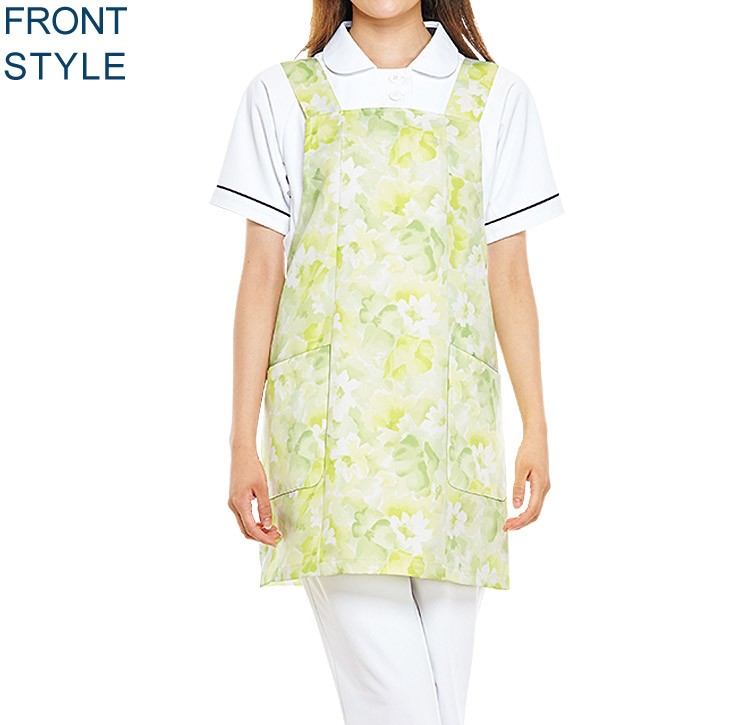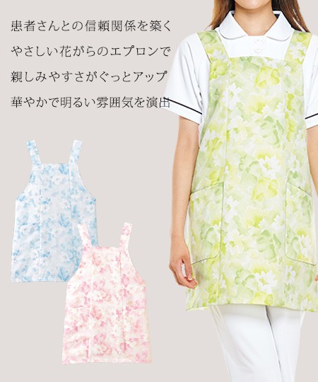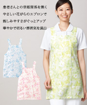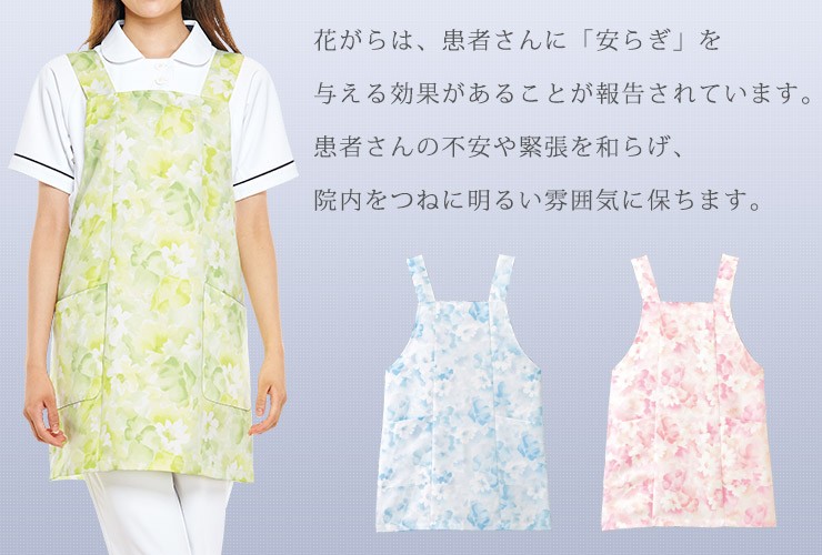 患者さんとの信頼関係を築く、やさしい花がらのエプロンで親しみやすさアップ。