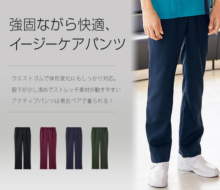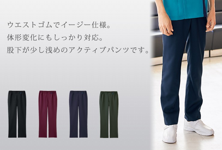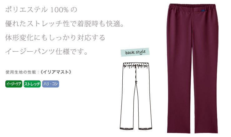 ウエストゴムでイージーパンツ仕様のストレートパンツ。体形変化にもしっかり対応します。 股下が少し浅めでストレッチ素材が動きやすいアクティブパンツです。