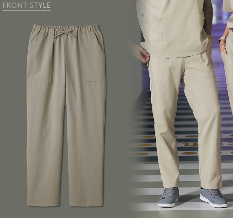 - 総ゴム(ウエストひも入り)、両脇ポケット、後ろ右パッチポケット