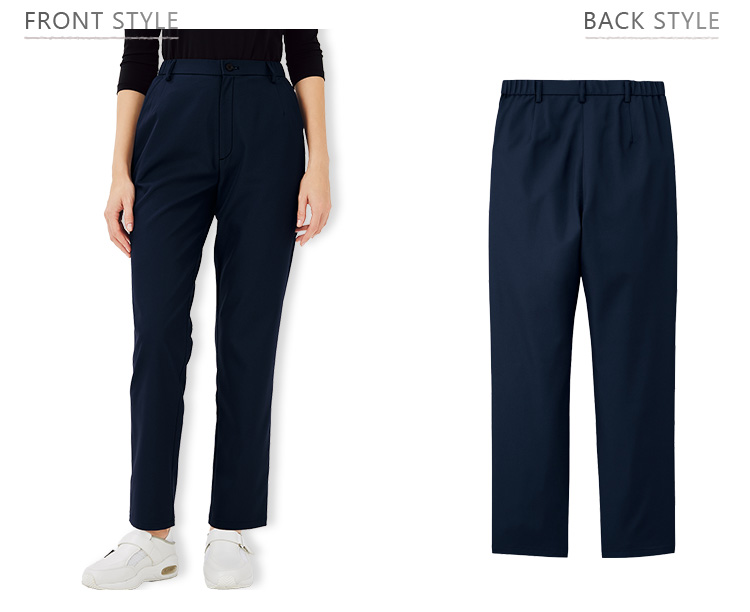 らくらくストレッチで美シルエットの女性用のスリムテーパードパンツ。 裾に余分な生地の余りがなく、足さばき良いです。 軽くて丈夫な素材のアリオンストレッチは、伸縮性のよいストレッチ生地で、動きやすさはもちろん、ポリエステル100%で、優れたイージーケア性も嬉しいポイント。 従来よりパターンを改良したことで、ほどよいゆとり感で見た目のシルエットのキレイさを追求し、腰回りとお尻の納まりが良くなり、一日中ストレスなく快適に着用していただけます。 デザイン・機能性ともに女性に嬉しいスクラブパンツです。