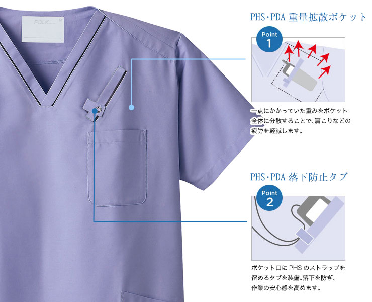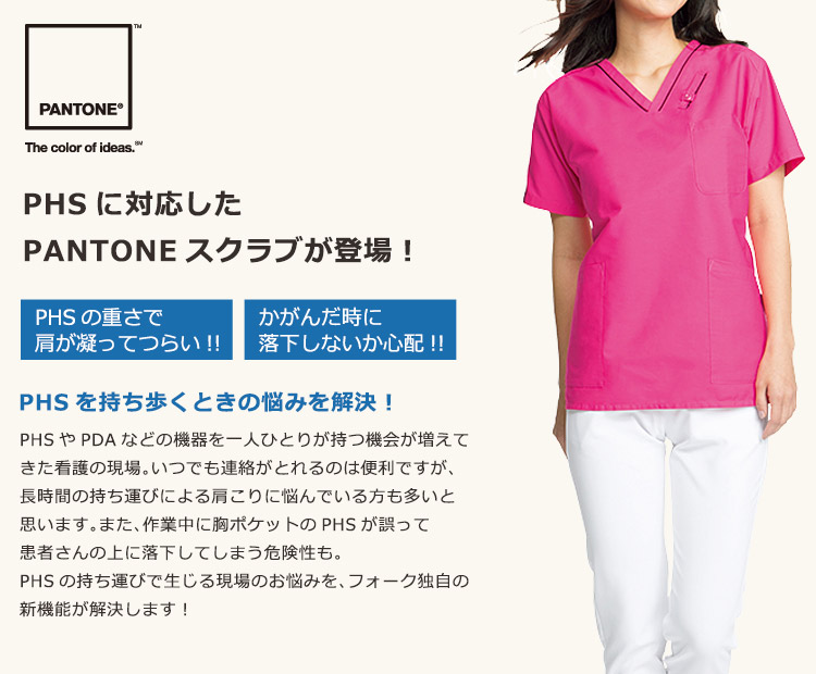 PHSを持ち歩くときの悩みを解決! 長時間の持ち歩きによる肩こりや、胸ポケットのPHSが誤って落下してしまうのを防ぐ新機能が搭載! パントンのカラフルなカラーバリエーションと、高機能ポケットで作業効率アップ!