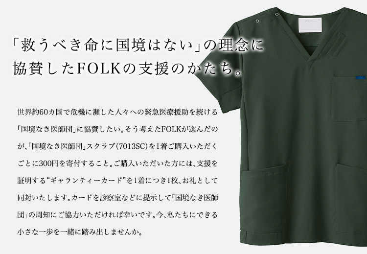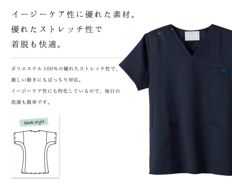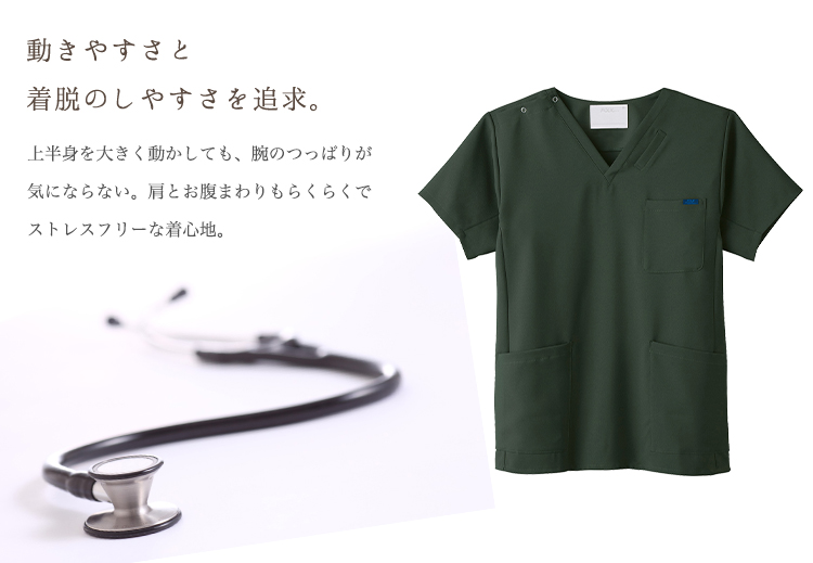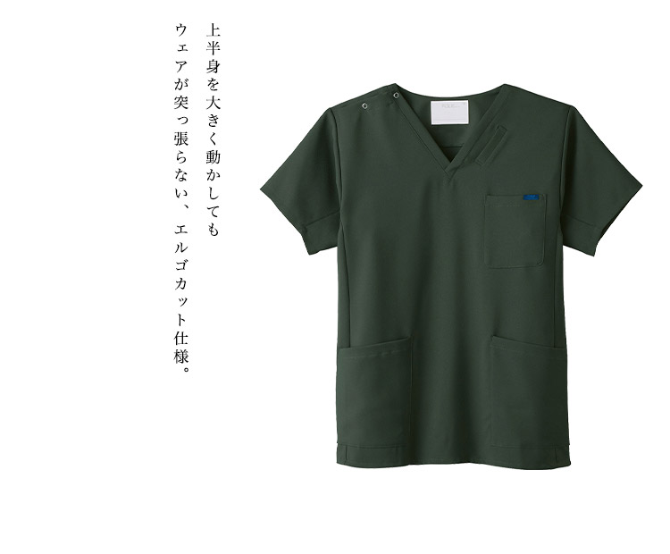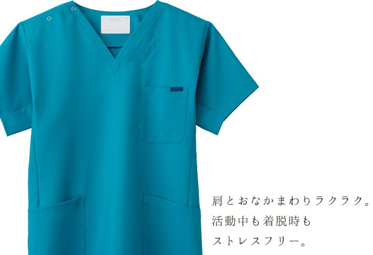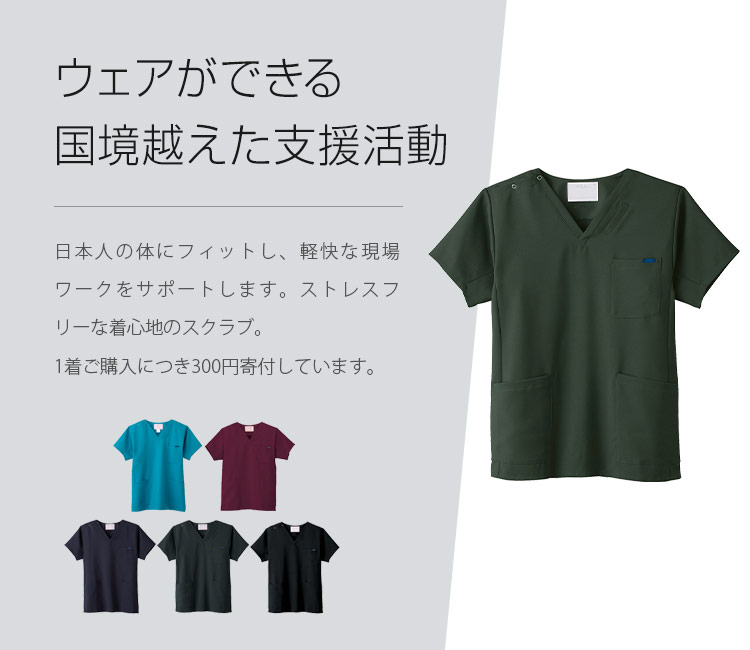 動きやすさと着脱しやすさを追求したスクラブです。 人間工学に基づいた上半身を大きく動かしてもウェアの突っ張りが気にならない「エルゴカット」仕様のため、 肩とお腹まわりラクラクで、活動中も着脱時もストレスフリーな着心地です。 この商品はご購入1着につき300円が「国境なき医師団」に寄付されるアイテムです。 鮮やかなターコイズを含む全7カラー。