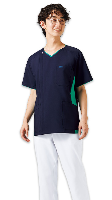 166cm 67kg、スクラブとしては大きめデザイン Lサイズが少しブカブカします。冬に暖かめのインナーの上から着用してみます。サイドのアクセントの色は水色よりはグリーンに近い感じです。