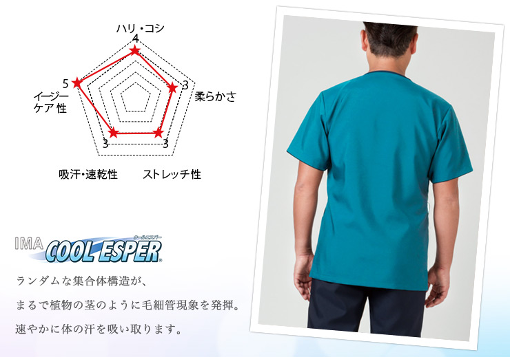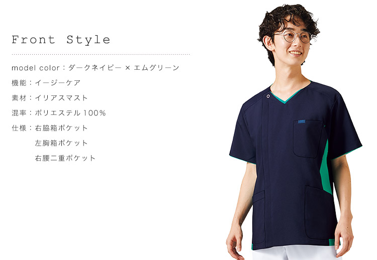 166cm 67kg、スクラブとしては大きめデザイン Lサイズが少しブカブカします。冬に暖かめのインナーの上から着用してみます。サイドのアクセントの色は水色よりはグリーンに近い感じです。