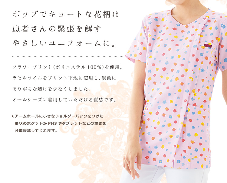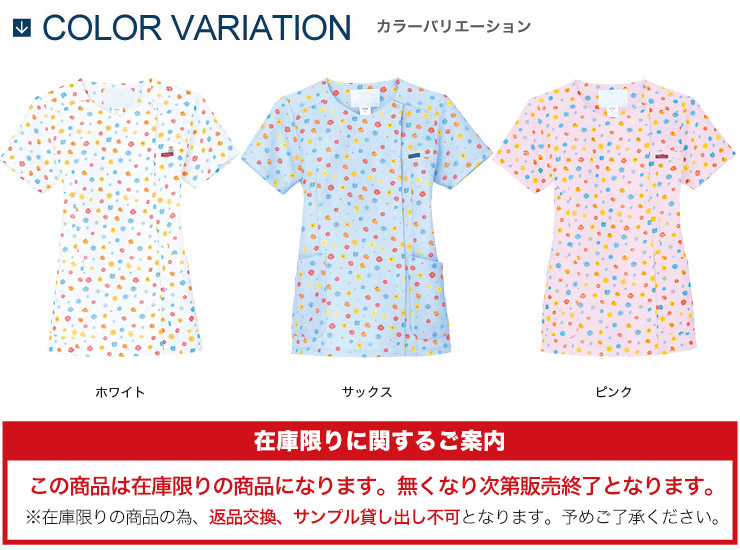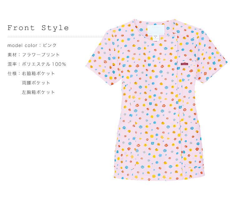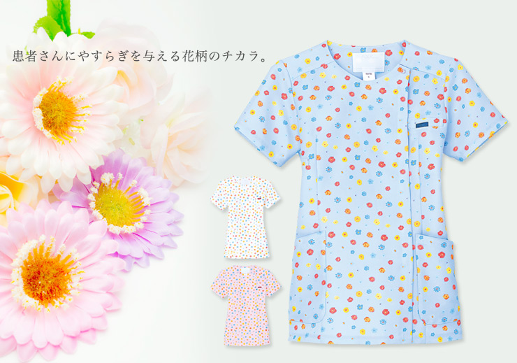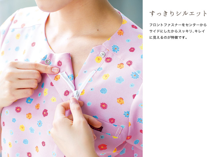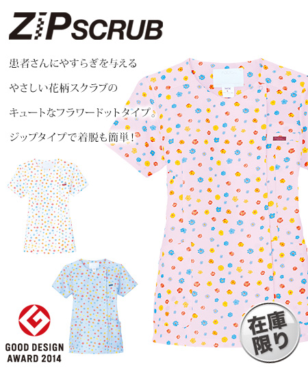 ポップで明るい印象を与えるフラワドット。 患者さんにやすらぎを与える、人気の花柄スクラブのシリーズです。 ジップアップタイプなので、メイクやヘアセットが乱れず着脱ができます。 "ジップスクラブ"ならび"ジップアップスクラブ"はフォーク(FOLK)の登録商標です。