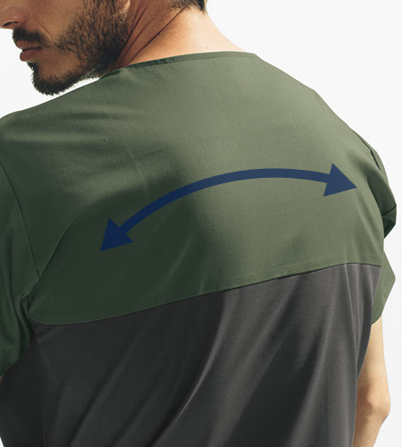 吸湿速乾性があり、動きやすいストレッチ素材の生地を採用。 洗いざらしのような独特の風合い。左胸ポケット